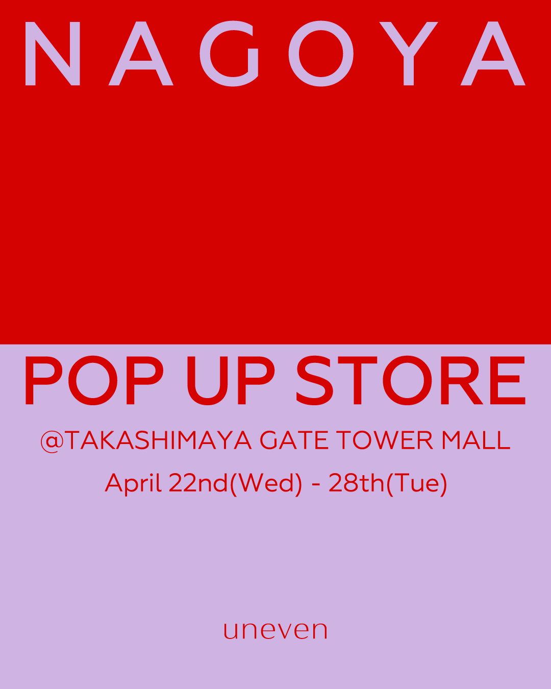 いつもunevenをご愛顧いただき誠にありがとうございます。4月22日(水)から4月28日(火)まで愛知県名古屋市にある「タカシマヤ ゲートタワーモール」にてcrinkle crinkle crinkleとの共催によるPOPUP STOREを開催いたします。